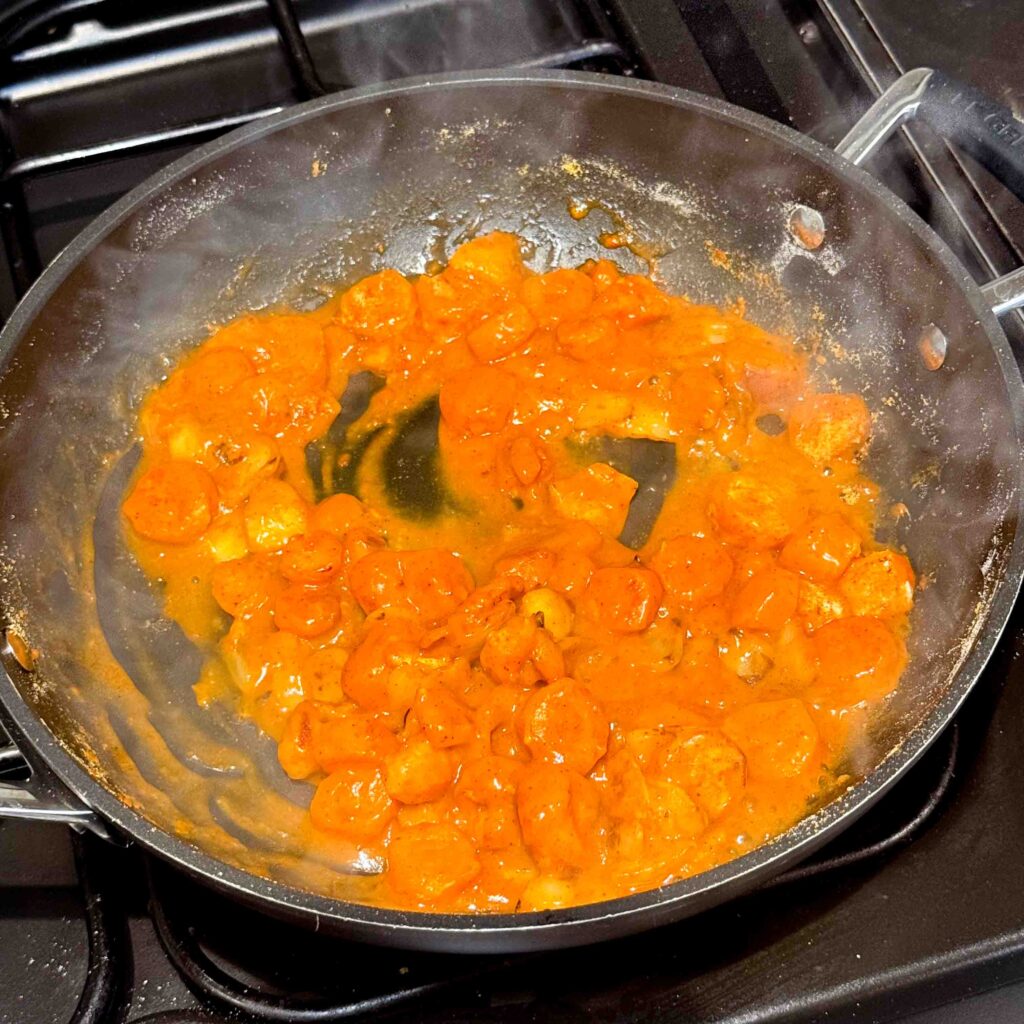 6. Pour some of the stock into the pan and stir to form a sauce (you don’t need to add all of it in at this point)