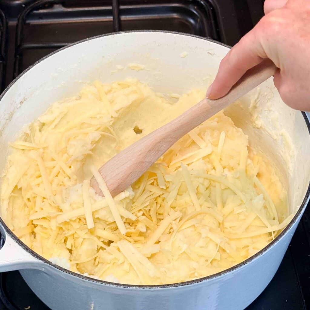 - Sprinkle over the grated cheddar and continue mashing until the cheese has fully melted and is evenly incorporated.